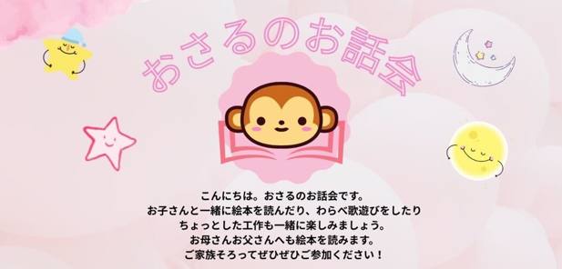 日時:2025年9月27日㈯14:00~15:00参加費:300円定員:5組(申込制)申込み・お問い合わせ:おさるのお話会 田村和子①お名前②お子様のお名前と生年月日③当日連絡のつくお電話番号※上記について記載の上 おさるのお話会のラインへお願いします。